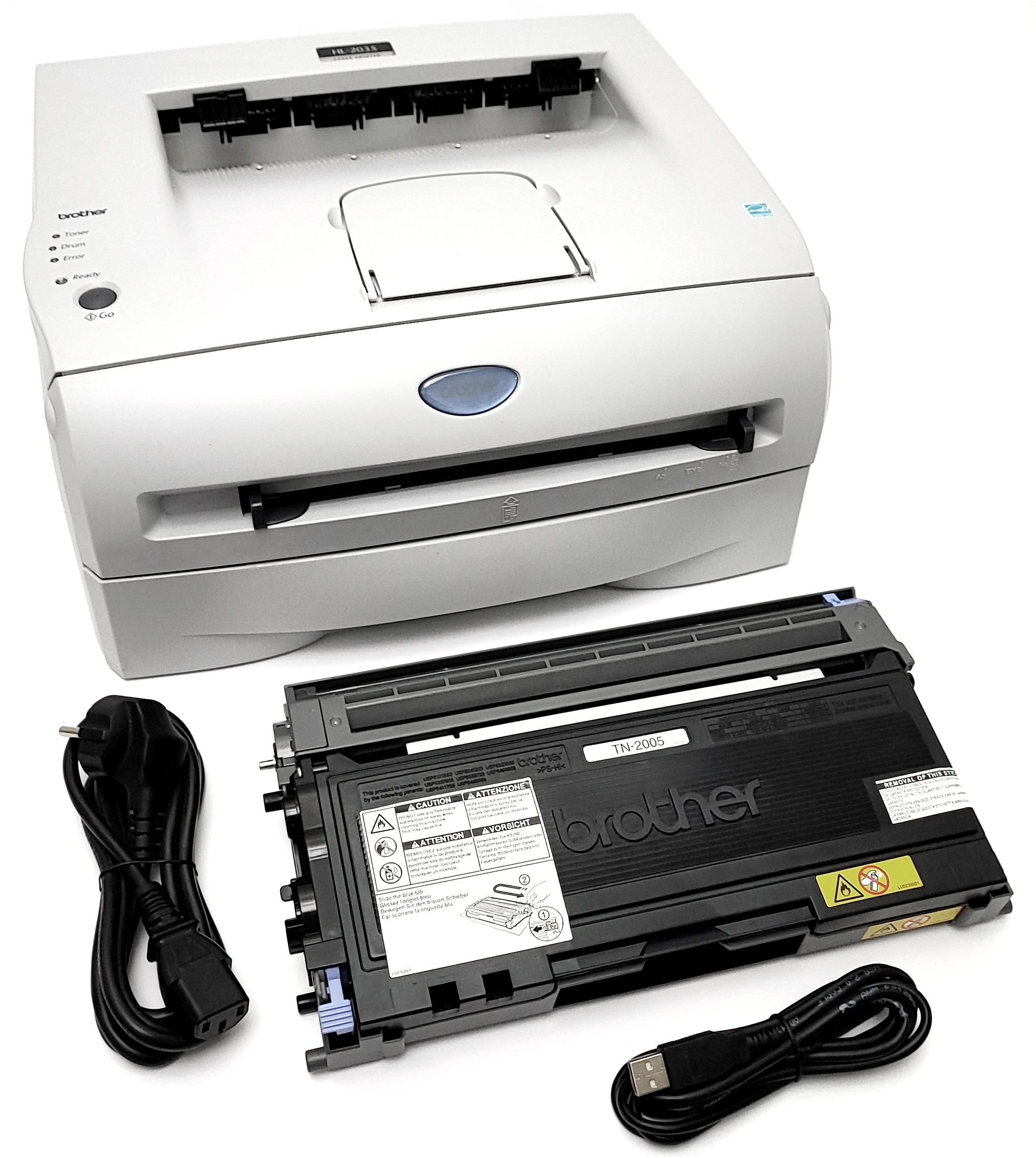 W zestawie: drukarka, pełen toner (100%), kabel zasilający 220V, kabel USB