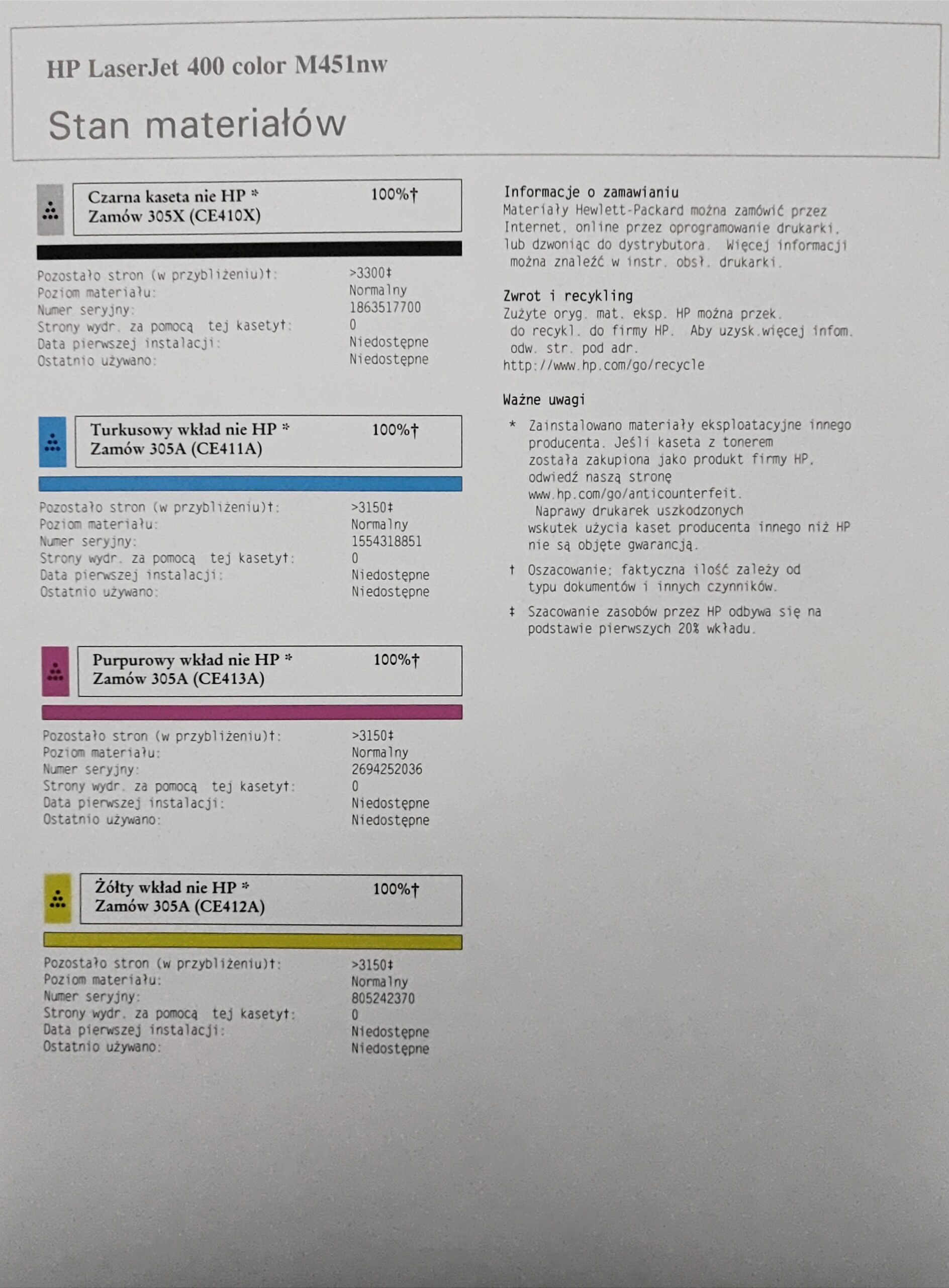 Drukarki sprawne technicznie bez żadnych ukrytych wad. Wydruki czyste, ladnie, zaczernione