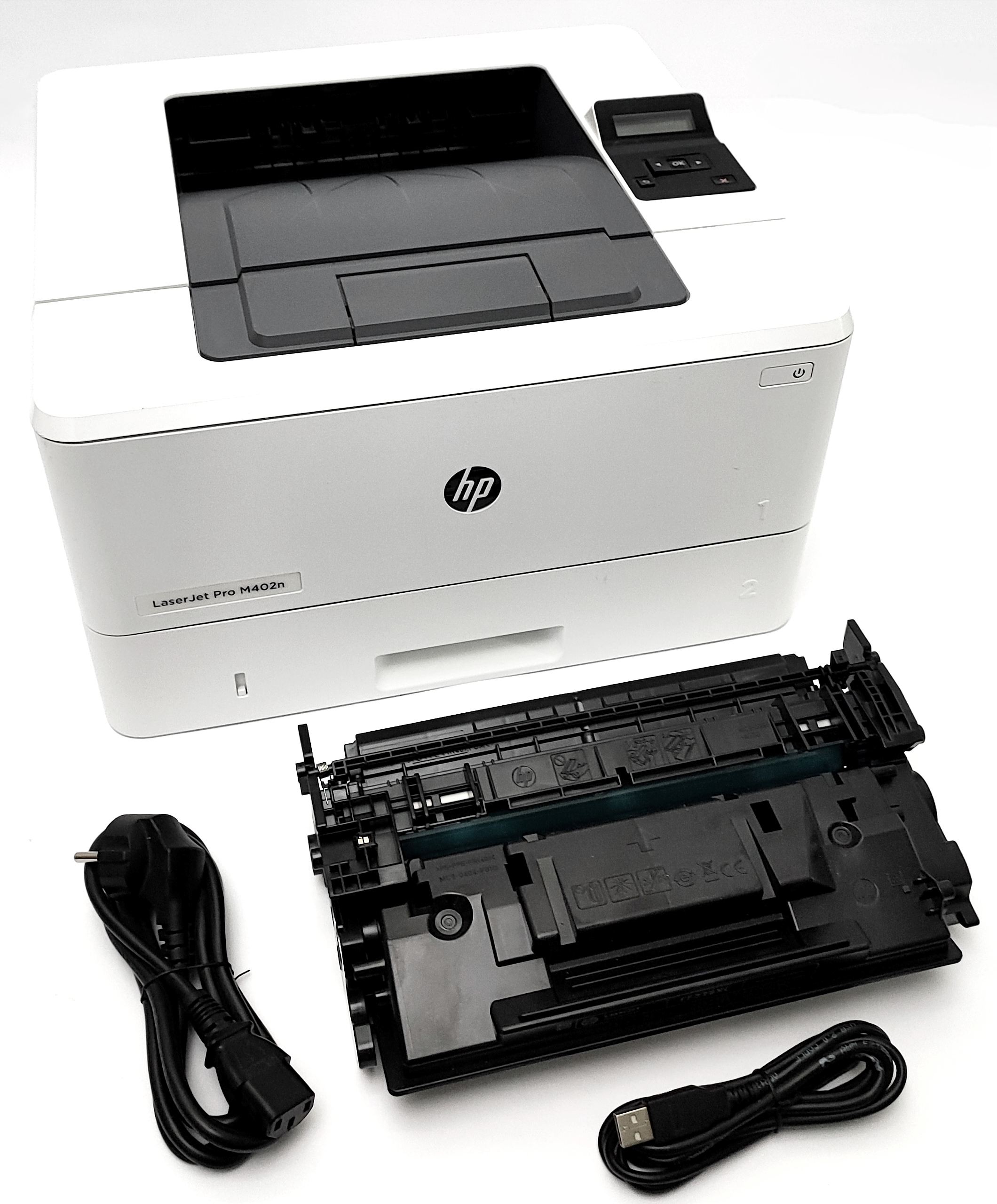 W zestawie: drukarka, pełen toner 100%, kabel zasilający 220V, kabel USB.