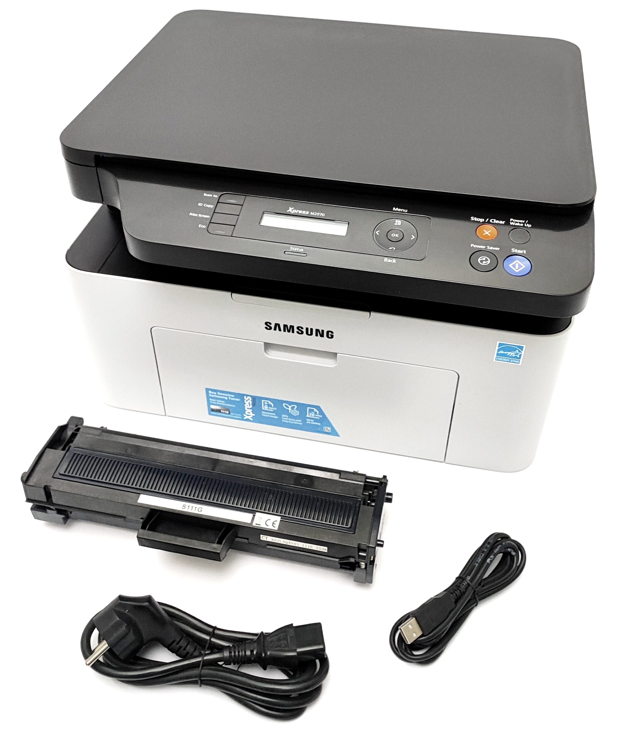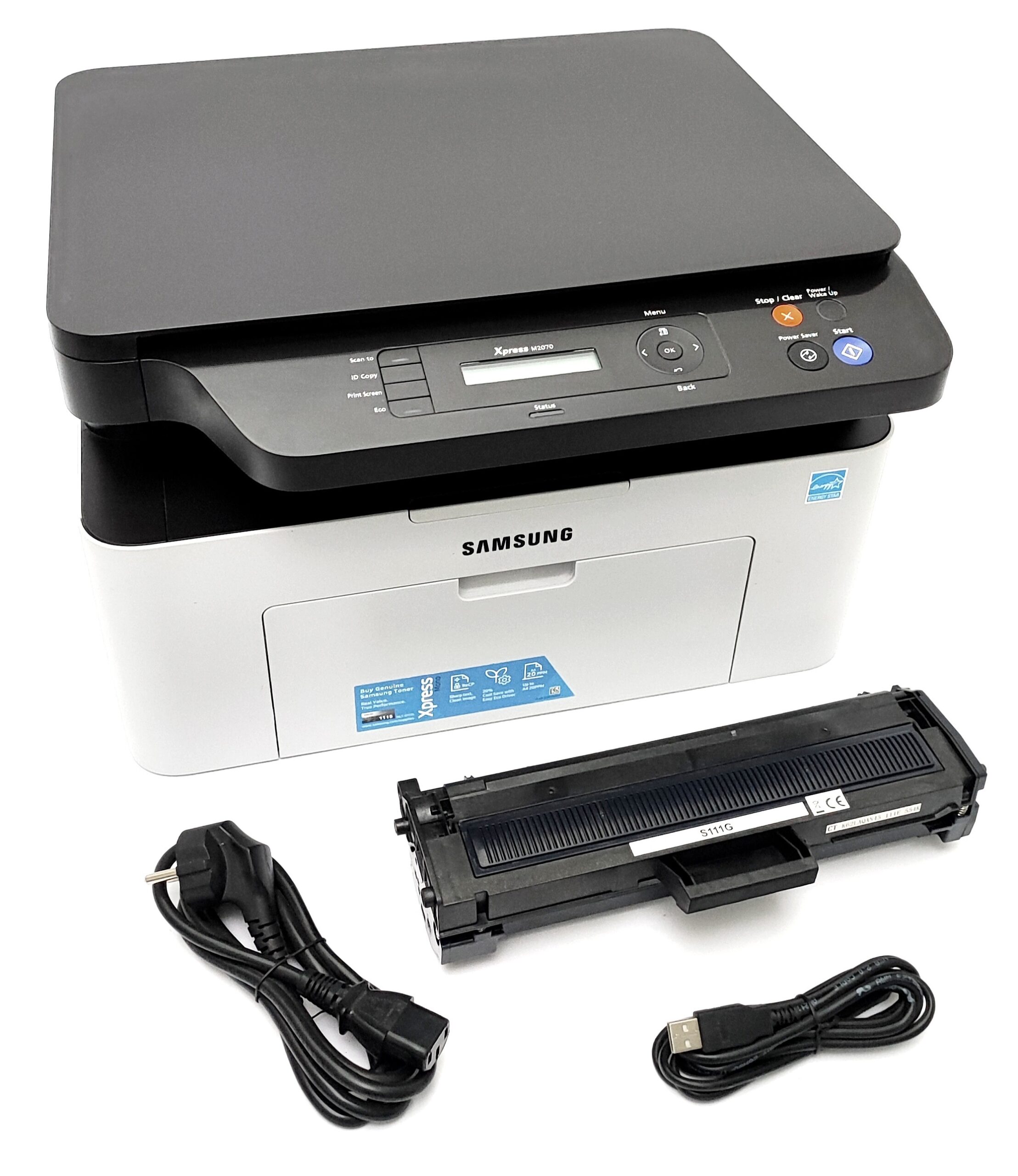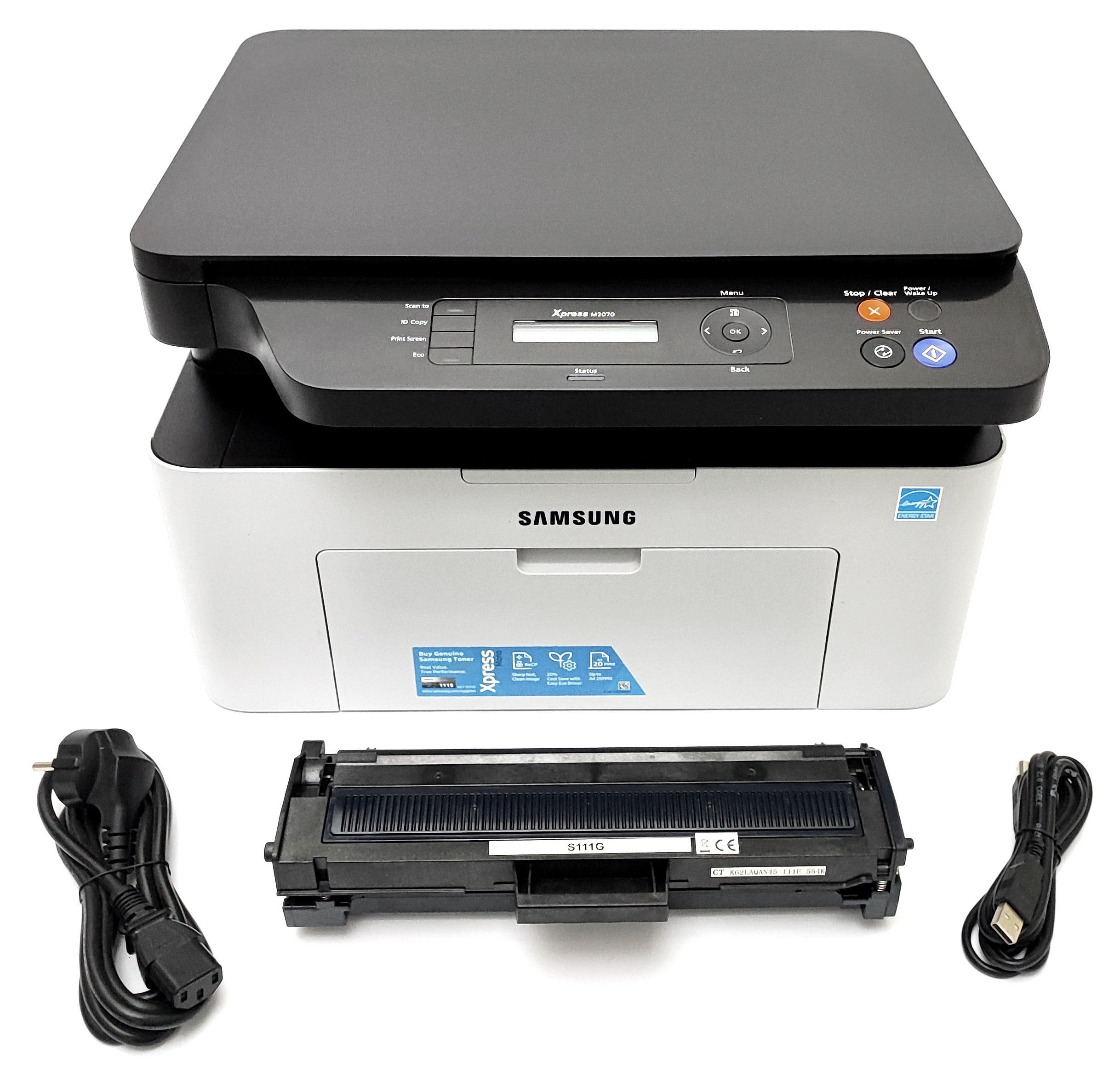 W zestawie: urządzenie wielofunkcyjne, pełen toner (100%), kabel zasilający 220V, kabel USB